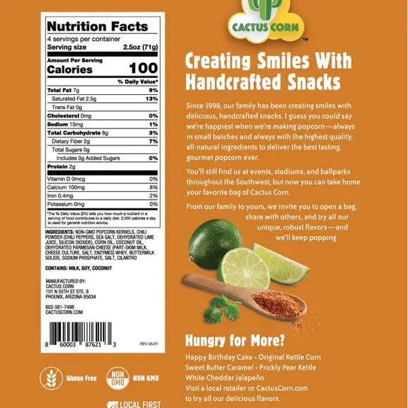 Say hello to the Roasted Street Corn Kettle Corn! A bold, fiesta-ready mash-up of farmers-market freshness and ballpark crunch. Then comes the flavor parade: nutty Parmesan showers, bright garden-fresh cilantro, and a zingy dusting of Arizona-style Tajín crafted from sun-ripened chiles and tangy lime.