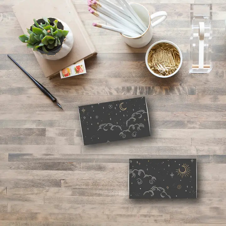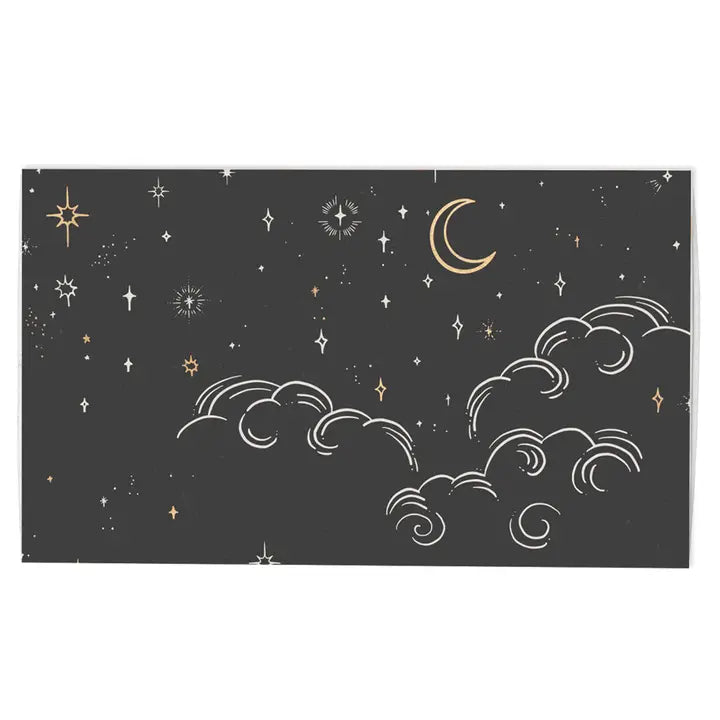 Featuring a mystical design of gold foil stars, moons, and swirling clouds on a dark backdrop, this matchbox is perfect for adding a moody, ethereal vibe to any seasonal setting.