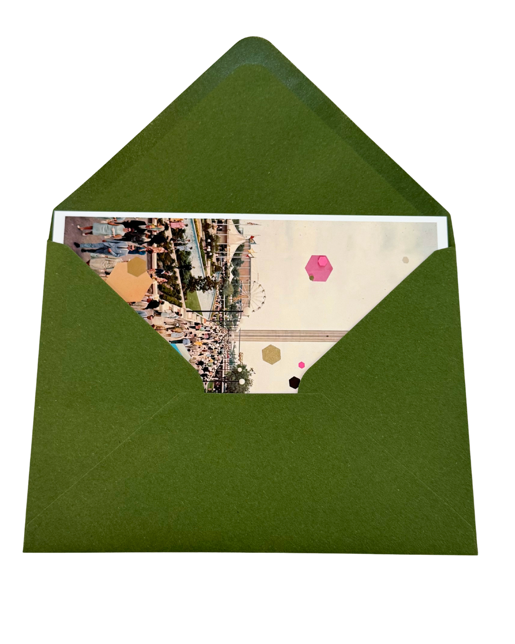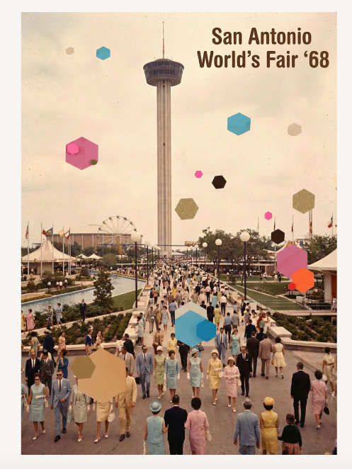 This vibrant card is inspired by the 1968 World’s Fair in San Antonio, featuring the iconic Tower of the Americas rising above the scene. With colorful, retro-dressed figures and Kelly’s signature collage style, it captures the fun and energy of the era in a bold, playful way.